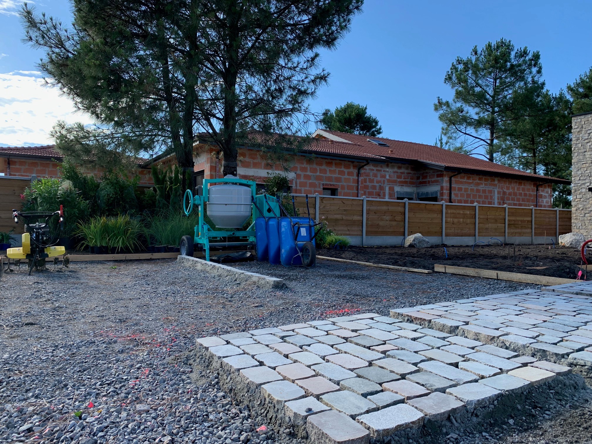 jardin complet sur maison neuve, terrassement, apport de terre végétale, arrosage automatique, plantations, gazon de placage, pavage, béton désactivé, bardage bois