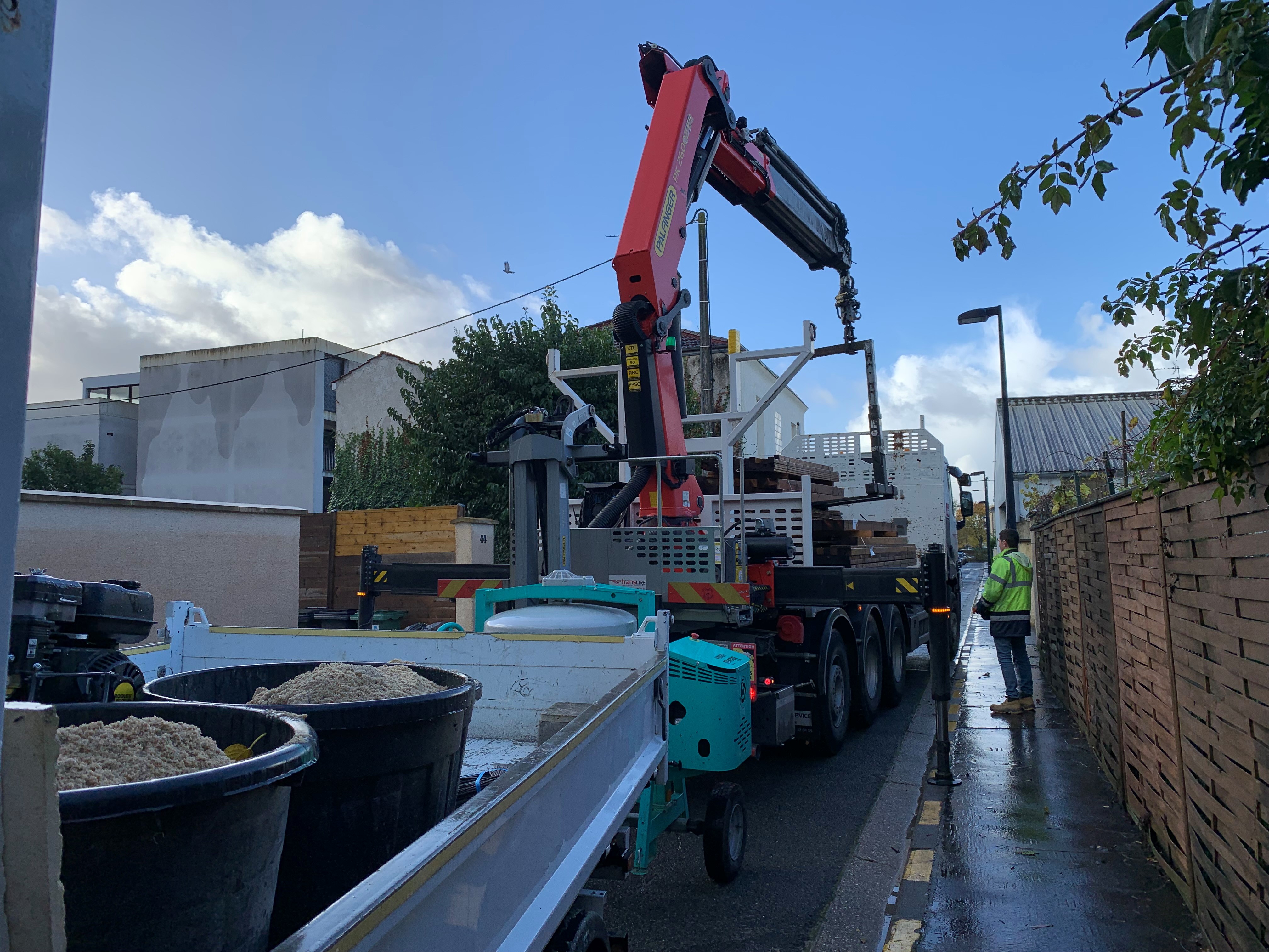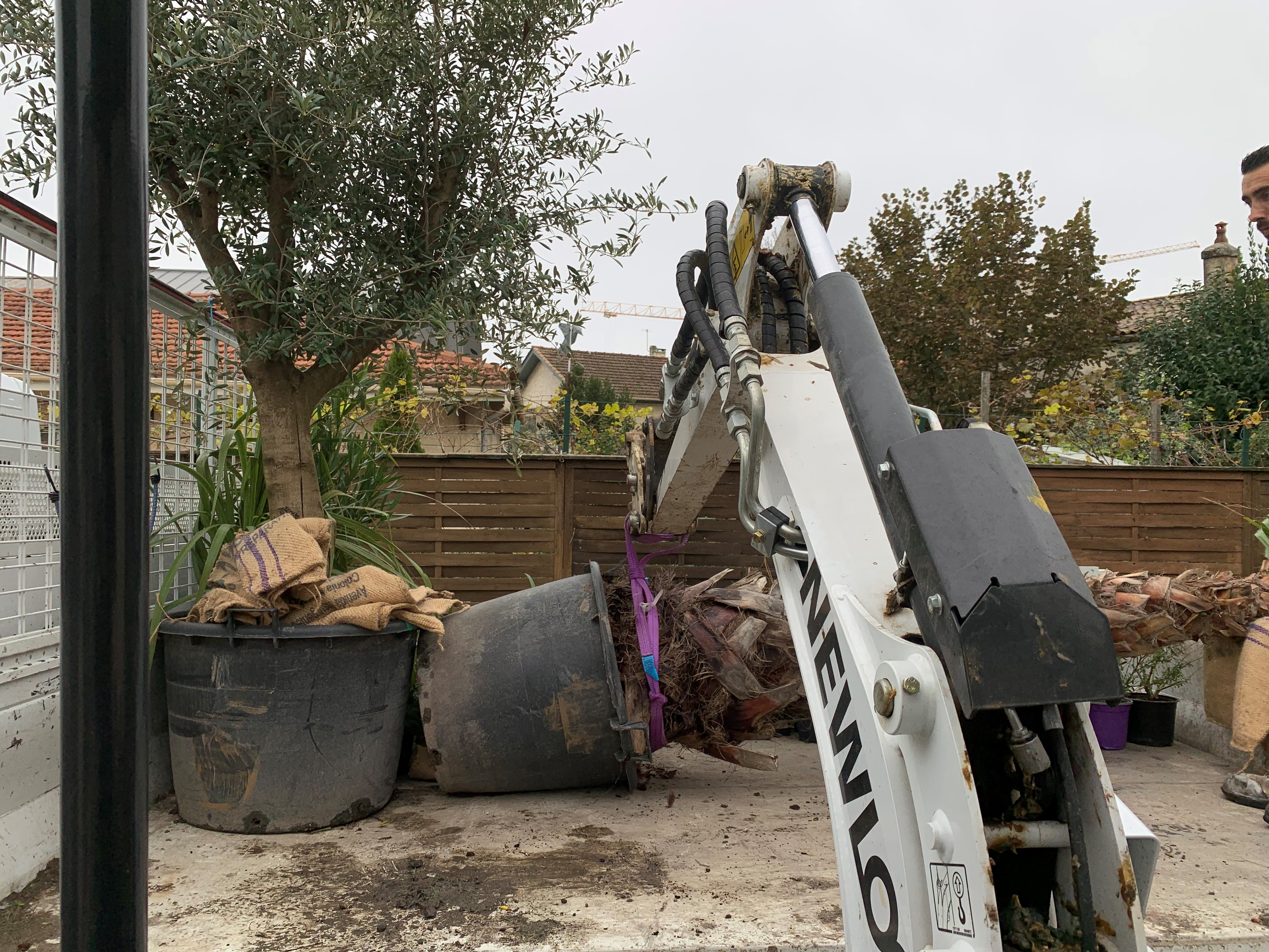 Après avoir réalisér les travaux préparatoires ( arrachage des végétaux, retrait du pavage non conservé ), nous avons réalisé les terrassements pour préparer l'ensemble des travaux.