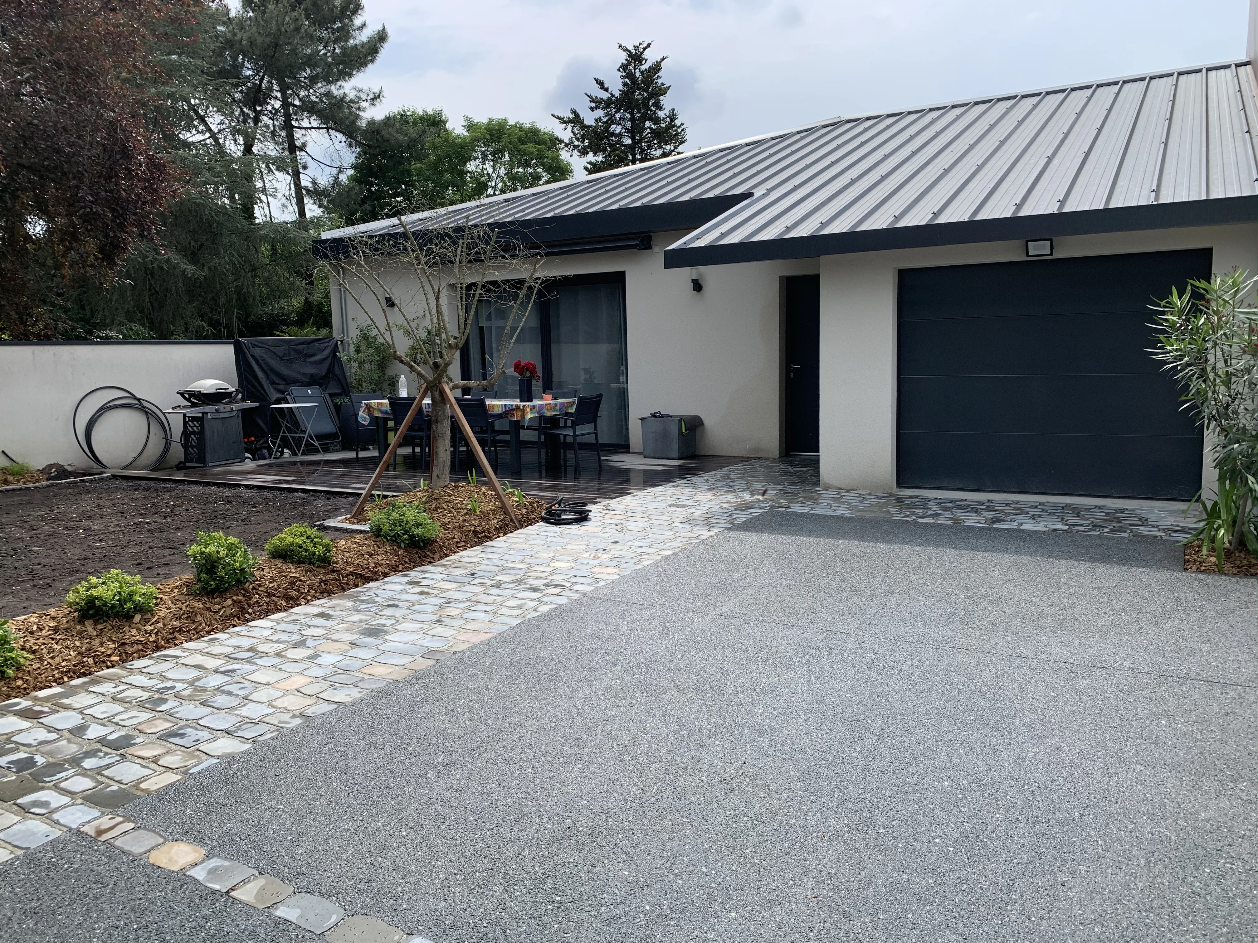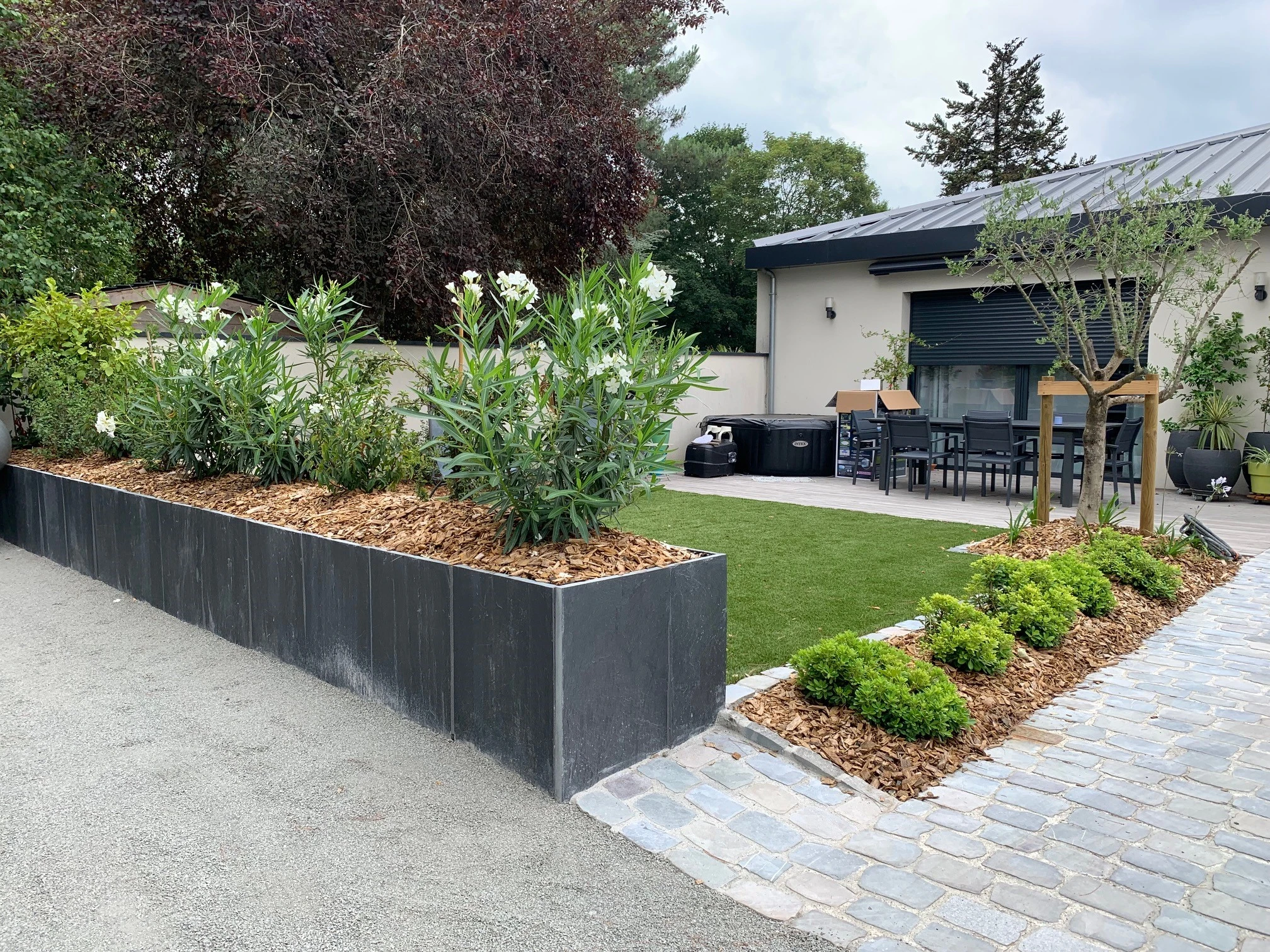 Maçonnerie paysagère, Plantation d'arbustes, Mise en place gazon synthétique, Pavage d'une allée, Coulage d'un béton décoratif